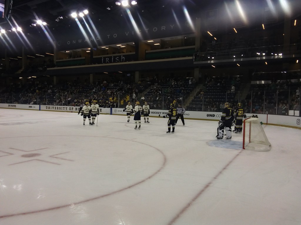 The Friday game, which I had the misfortune of attending, looked decently close through the first period as the teams traded power play goals. Then the skunkbears cracked things open in a big way in the second, with three goals before the halfway mark basically burying the Irish for the third straight game. It was a long cry from Notre Dame’s season sweep of M***igan a year ago. Irish frustration started to boil over in the third period as three separate fights broke out, including a lengthy one after the skunkbears charged at goalie Ryan Bischel. Though hockey is a sport where this kind of extracurricular activity is arguably a feature, the college game doesn’t usually get this chippy, according to (limited) experience and what I hear from others. Clear rivalry emotions were running high.
